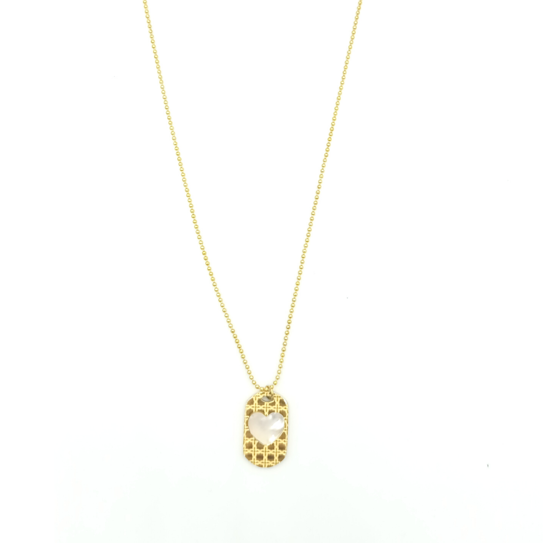 Κολιέ με στοιχείο άσπρη καρδούλα ,σε πλακέτα, σε  χρώμα χρυσό. Κατασκευασμένο από ανοξείδωτο ατσάλι.