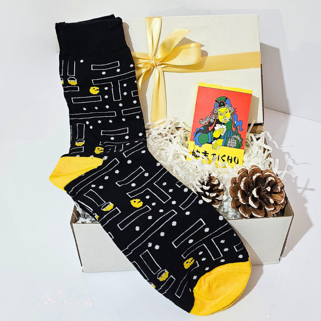 - Ένα ζευγάρι κάλτσες Pac Man στις αποχρώσεις του μαύρου και του κίτρινου