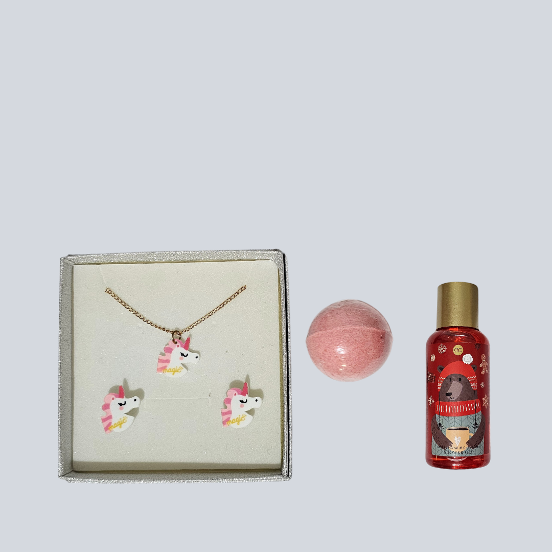 Υπέροχο Σετ Κοσμημάτων Unicorn , που αποτελείται από κολιέ και σκουλαρίκια Unicorn, με παιδικό κούμπωμα.